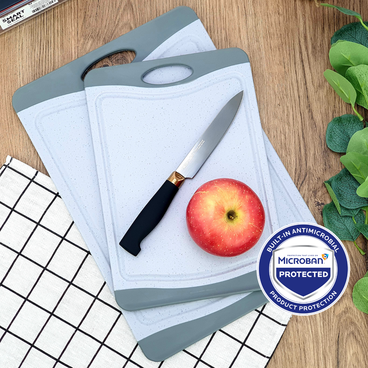 Worried about germs on your cutting board? Neoflam’s cutting boards are engineered with Microban® antimicrobial technology, a built-in solution that actively inhibits the growth of different bacteria that cause stains, odors, and product degradation. Unlike surface coatings, Microban® is embedded into the board during manufacturing, ensuring round-the-clock protection that lasts the product’s lifetime.